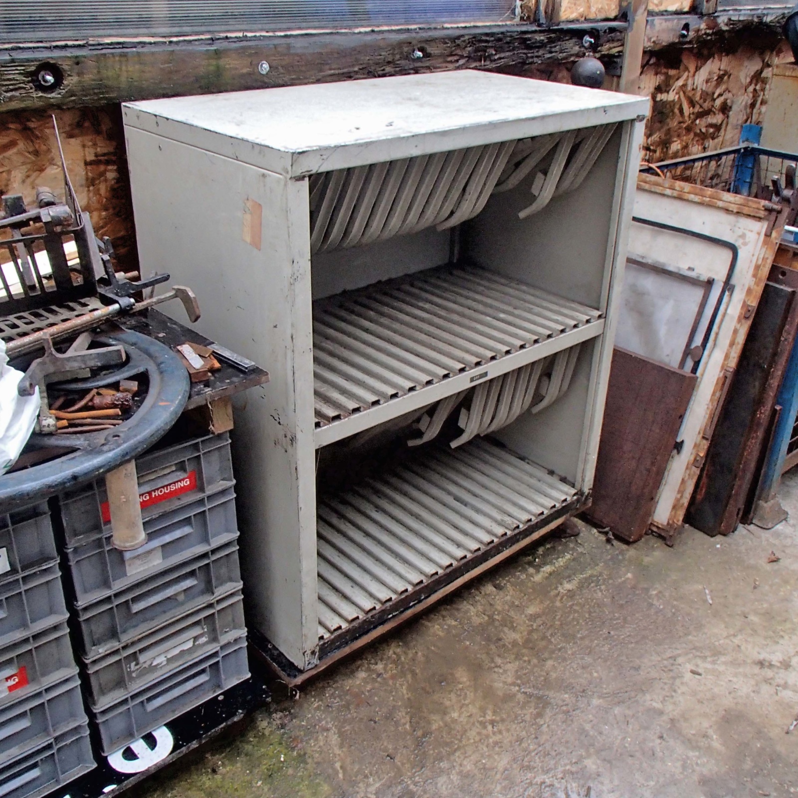 Crown Forme Rack with adjustable tops for different size chases… maximum chase size 21″ deep x 16″ high. Two rows of 18 sets of slots for 36 empty chases or full formes. Very solid and sturdy so quite big and heavy… 35.5″ wide x 20.75″ deep x 39.5″ high (90cm x 53cm x 100cm).